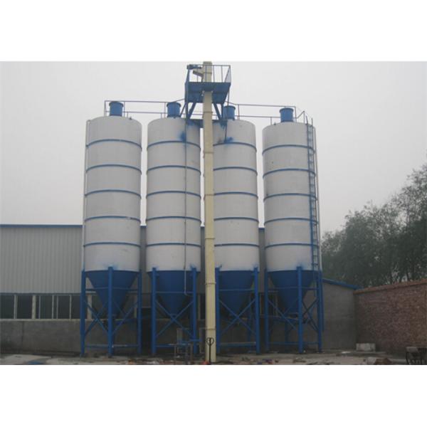 The cement silo has a cylindrical structure, and the bottom is supported by four round tube legs. The whole silo is in the form of steel structure and welded; the top is provided with a dust collector and a pressure safety valve.